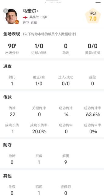 制胜功臣!马奎尔全场数据:破门制胜,9次解围闪耀防守端